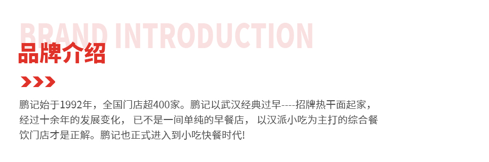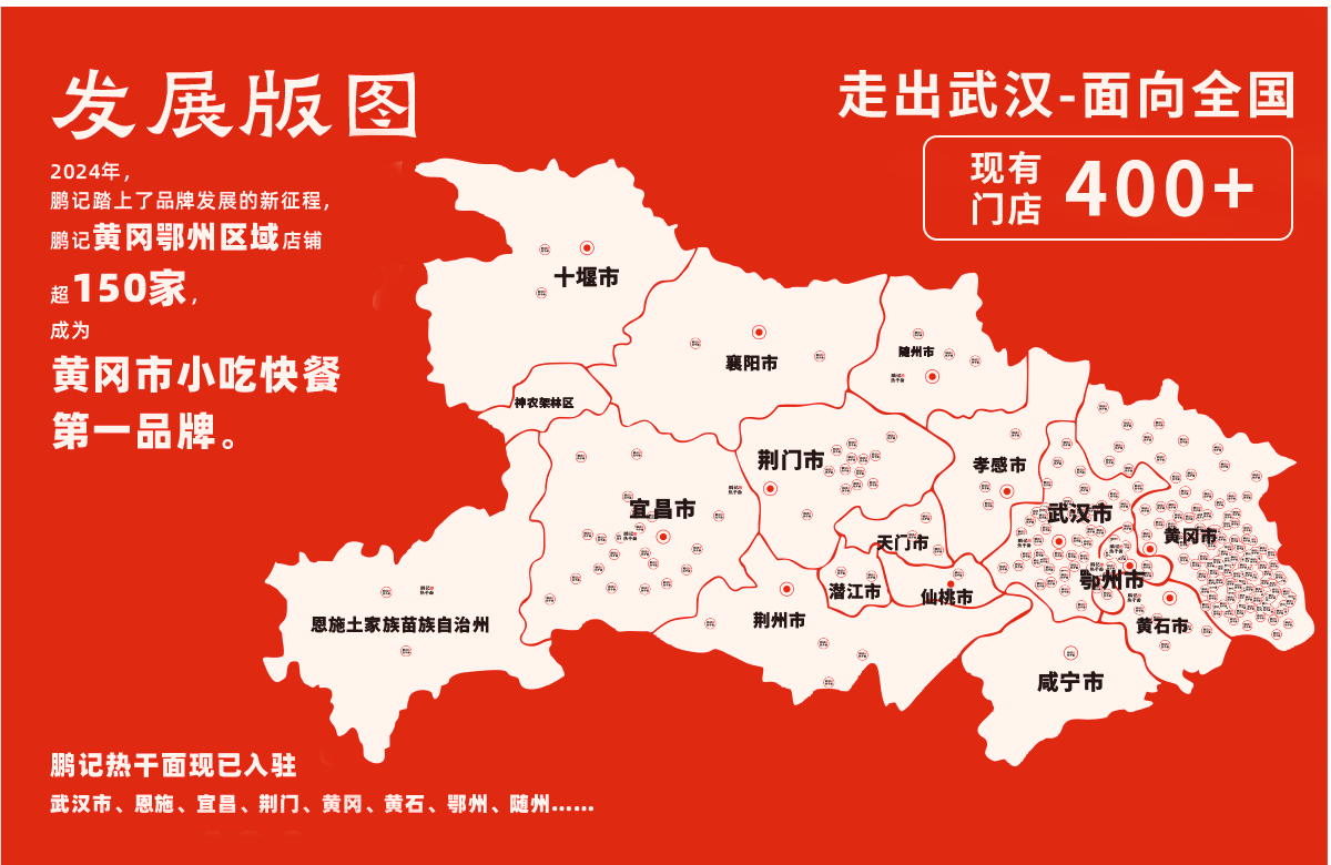 鹏记热干面,作为一家武汉本土餐饮企业,自1992年首家店铺发展至今已转变成企业化运作的成熟品牌,秉承着“弘扬中华传统美食,用心做好每一碗面”的理念,在湖北向下扎根,经营模式从传统面馆转化为小吃快餐复合型店,主营热干面、鲜肉生煎包、豆皮、糊米酒、馄饨等数十种武汉传统小吃,搭配小炒、盖浇饭等特色中餐,目前全国门店已突破400+。