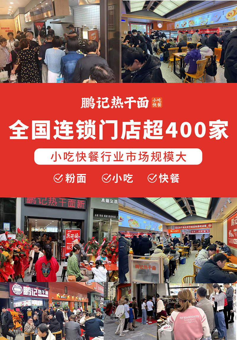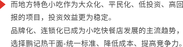 而地方特色小吃作为大众化、平民化、低投资、高回报的项目,投资效益更为稳定。品牌化、连锁化已成为小吃快餐店发展的主流趋势,选择鹏记热干面-统一标准、降低成本、提高竞争力。